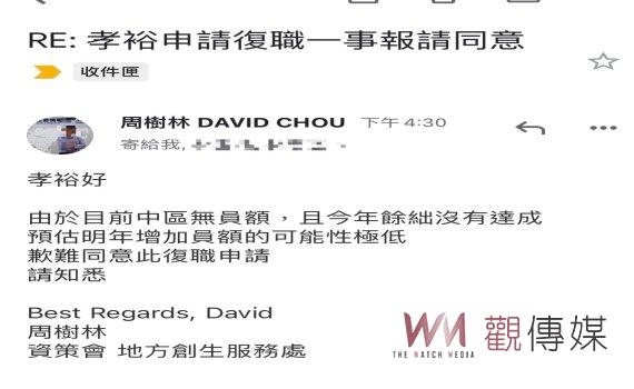 周樹林E-mail第一次回信中指出「由於目前中區無員額,且今年餘絀沒有達成,預估明年增加員額得可能性極低,歉難同意此復職申請」。王孝裕說,該單位仍在人力網刊登徵才需求,向該單位抗議周樹林所說沒有職缺與事實不符,周樹林卻又回信表示「開立職缺並不代表立即有人力需求」為由拒絕。