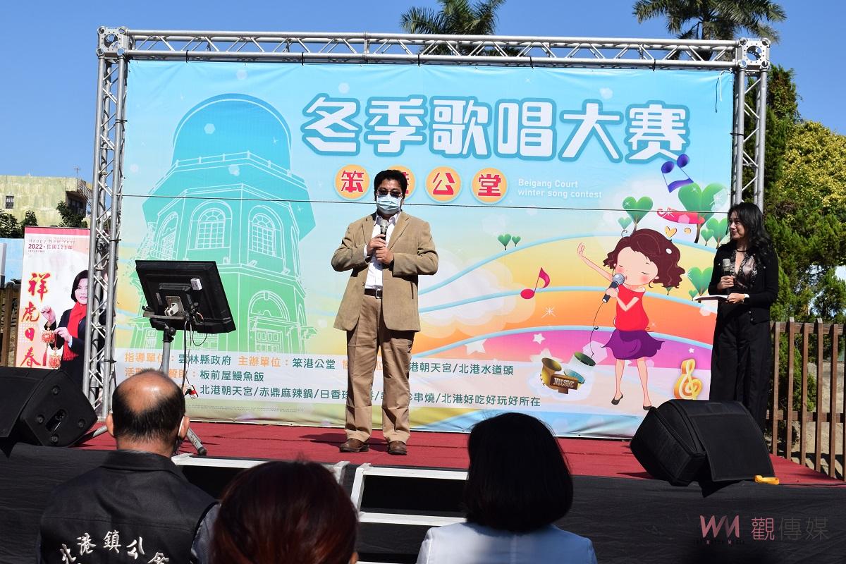 ▲冬季歌唱大賽季賽在北港水道頭文化園區熱情開唱。笨港公堂堂主許展彰致詞。