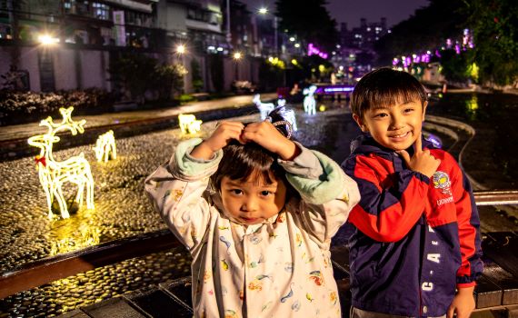 另外,在蘆洲鴨母港溝夜晚因光雕燈飾的妝點,變得更加活潑生動且璀璨浪漫,當漫步於色彩斑斕林蔭步道時,彷彿沉浸在奼紫嫣紅的夢幻世界,還能聽見潺潺流水聲,除此之外在河廊沿線於白鷺之衍、文化廣場、親水公園為迎接耶誕節到來,都已換上耶誕裝扮,結合燈光的輔助,傳遞滿滿溫馨浪漫的耶誕節慶。