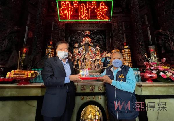 ▲臺鹽聯名文財殿推出限量發財水,董事長吳容輝(左)與主委羅元慶(右)進行過爐加持及祈福求財運。