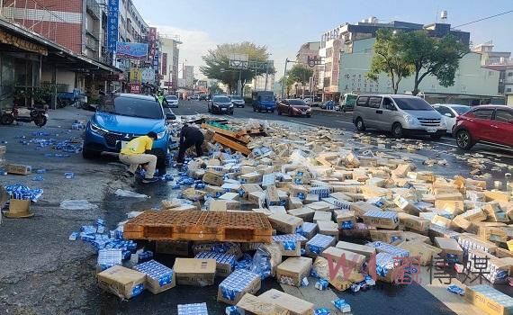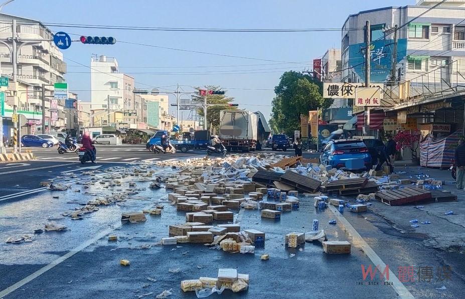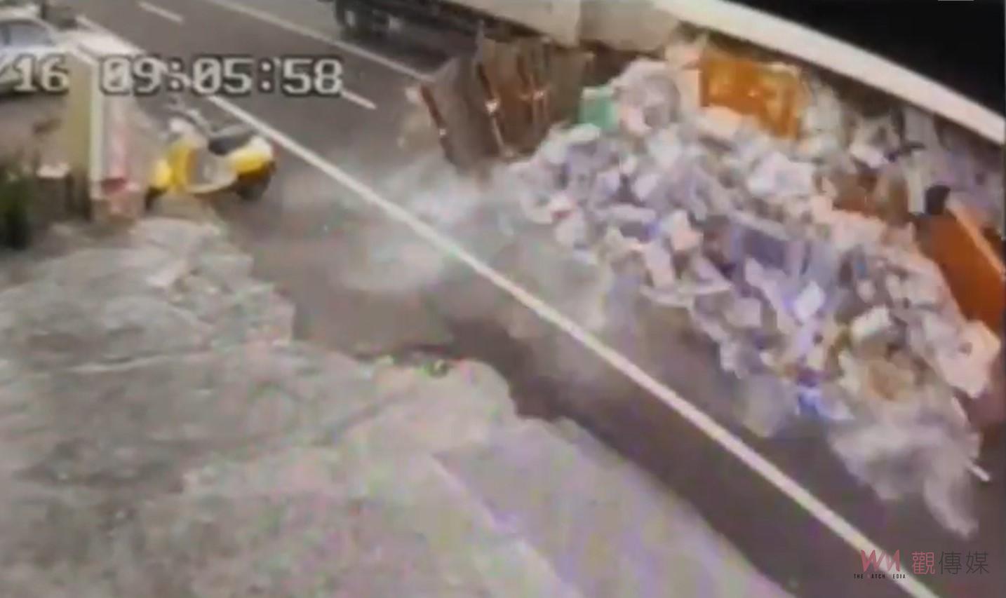 大貨車上貨物因重心不穩傾斜,導致大量貨物掉落於路面。