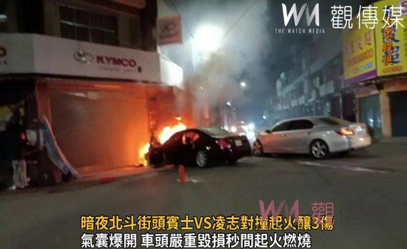 (觀傳媒彰化新聞)【記者陳雅芳/彰化報導】彰化縣北斗鎮地政路中興路口,昨(17)日深夜發生名車對撞車禍,賓士與凌志兩轎車路口對撞,疑似未互相禮讓,不慎發生碰撞,還引起火燒車,所幸車上駕駛與乘客都及時逃出,警消表示,這起事故共造成3人輕傷,火勢迅速撲滅,沒有波及到一旁民宅,詳細的肇事原因仍有待調查釐清。