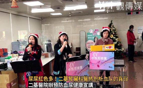 (觀傳媒彰化新聞)【記者陳雅芳/彰化報導】迎接溫馨的耶誕節到來,二林基督教醫院今(19)日舉辦血尿健康講座,員林和平教會「甄那樂團」以詩歌、生命故事、生活分享,傳揚耶穌降生帶來的愛、平安、喜樂,腎臟科醫師謝宗裕分送禮物,病人和家屬感受提前過節歡樂氣氛。