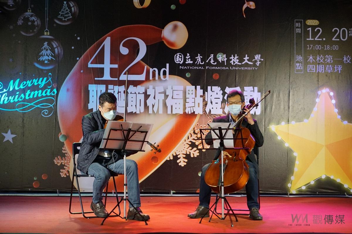 耶誕星光音樂會今年邀請雲林縣潮厝華德福小學合唱團美聲演唱「快樂真快樂」、「讓愛看的見」及「WE WISH YOU A MERRY CHRISTMAS」報佳音揭開序幕。校內則邀請深具音樂造詣的語言中心主任鐘證達,偕同材料科學與工程系主任方昭訓演出聖誕組曲弦樂二重奏,代表校內師長將溫暖祝福,透過樂音傳達給現場觀眾。