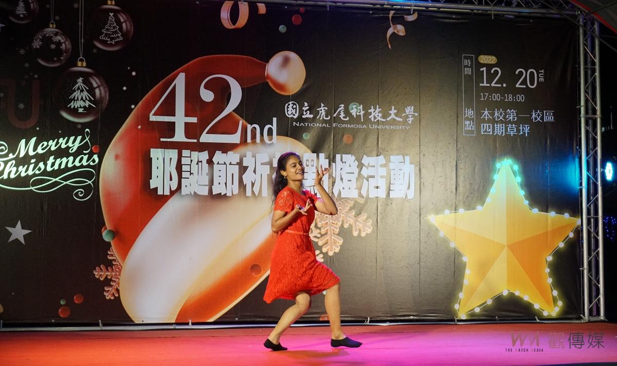 虎科大此次邀請來自成功大學的印度生跨校交流,並帶來傳統舞蹈演出,曲風結合寶萊塢及應景鐘聲,祝福虎尾科大並展現友好交誼,也引領觀眾體驗異國文化,另由虎科大管樂社演奏經典耶誕歌曲「Last Christmas」作為今日點燈儀式與音樂饗宴的壓軸演出,現場並發送耶誕糖果與全場觀眾分享節慶溫馨。