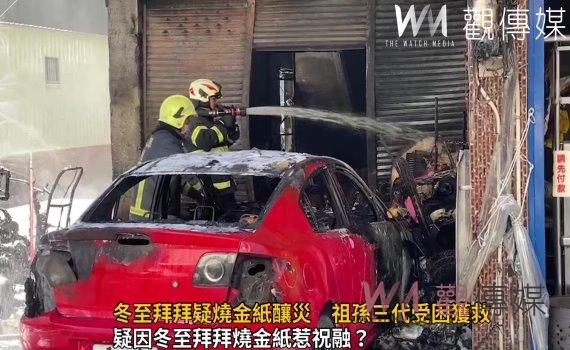 和美鎮忠信路今(22)中午發生火警,1樓騎樓堆放的雜物與停放的轎車、2輛機車陷入火海,火勢一度相當猛烈,屋內祖孫三代受困後陽台,消防員架設消防梯引導3人順利逃生,不過有些微嗆傷;當地居民說,今天冬至當時附近有人在燒金紙拜拜,沒想到強風把金紙吹到騎樓引發火災。