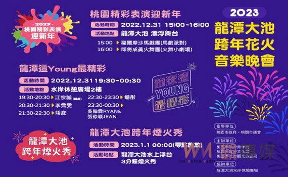 (觀傳媒桃園新聞)【記者曾平/桃園報導】龍潭大池是桃園市龍潭區的著名觀光景點,市府觀光旅遊局、文化局與青年局將於31日跨年夜,共同舉辦一場精彩壯觀的「2023龍潭大池跨年花火音樂晚會」,並在今年的最後一刻,長達180秒的煙火將點亮龍潭寂靜夜空,陪伴民眾熱鬧迎接新的一年。觀光旅遊局今(29)日邀請民眾,跨年來龍潭走透透,體驗小鎮慢活步調,感受煙花遍布龍潭大池夜空的絢麗光采。
