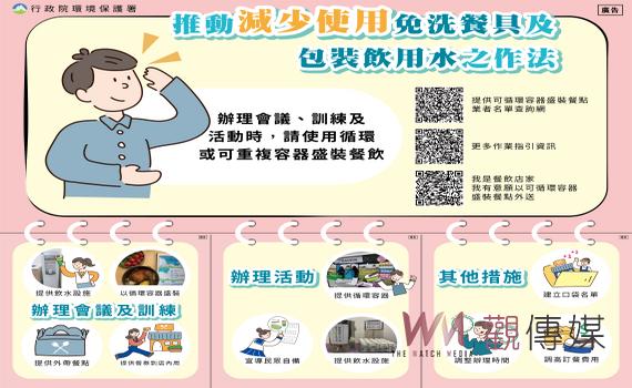 據環保署調查,台灣每年使用約35至50億個免洗餐具,為推動廢棄物源頭減量政策,減少資源消耗,抑制廢棄物產生,環保署依「資源回收再利用法」第7條及第8條規定函頒作業指引,規範行政機關、學校主辦或於其場所內辦理之會議、訓練、活動等,不提供免洗餐具、包裝水及一次用飲料杯,改提供可重複清洗餐具(如鐵盒便當)及設置飲水機或桶裝水,辦理活動以無償、租賃或押金借用方式提供重複清洗餐具。希望由政府機關、學校帶頭改變大眾生活習慣,養成「自備、重複、少用」的環保觀念。