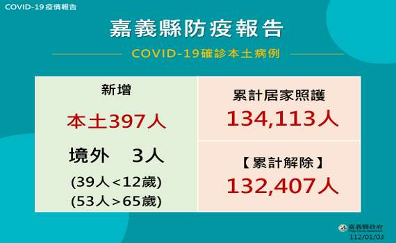(觀傳媒嘉義新聞)【記者 惲 朋 /嘉義報導】嘉義縣政府今(3)日公布400人確診(含境外3人),其中有症狀29人,無症狀371人。年齡介於7個月-93歲,12歲以下39人,65歲以上53人。累計全縣12歲以下染疫幼童17,723人,65歲以上20,090人,目前輕症居家照護1,706人。連日上升確診數,縣政府籲請民眾儘速追加接種次世代疫苗,以提升保護力。