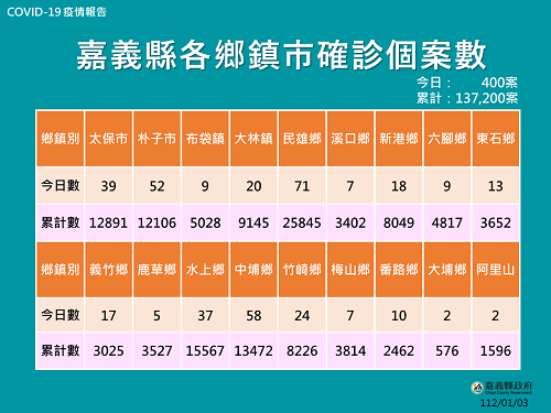 ▲嘉義縣新增400人確診,各鄉鎮市新增確診數。