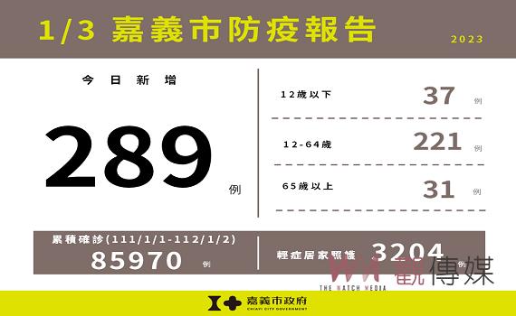 (觀傳媒嘉義新聞)【記者吳東林/嘉市報導】中央流行疫情指揮中心3日公布嘉義市新增289例確診個案,包含12歲以下37例,12-64歲221例,65歲以上31例。嘉義市目前輕症居家照護人數3,204人。111/1/1截至112/1/2嘉義市累計確診嚴重特殊傳染性肺炎本土病例數為85,970人。