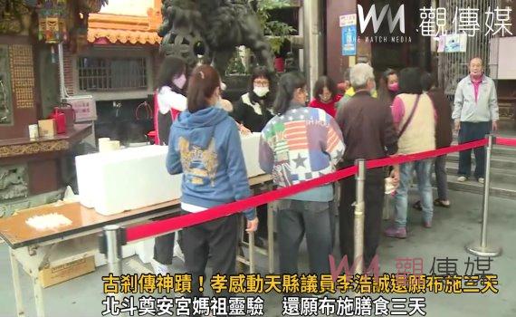 當時李浩誠向北斗奠安宮媽祖許願如果他的父親病癒,將布施膳食3天、每天300人分量。李榮秀經治療病情好轉出院,李浩誠選在彰化縣年底五合一選舉結束後的一個月還願,布施白飯、滷肉、菜湯,每人分量足夠,取用的民眾都說,誠意有夠!