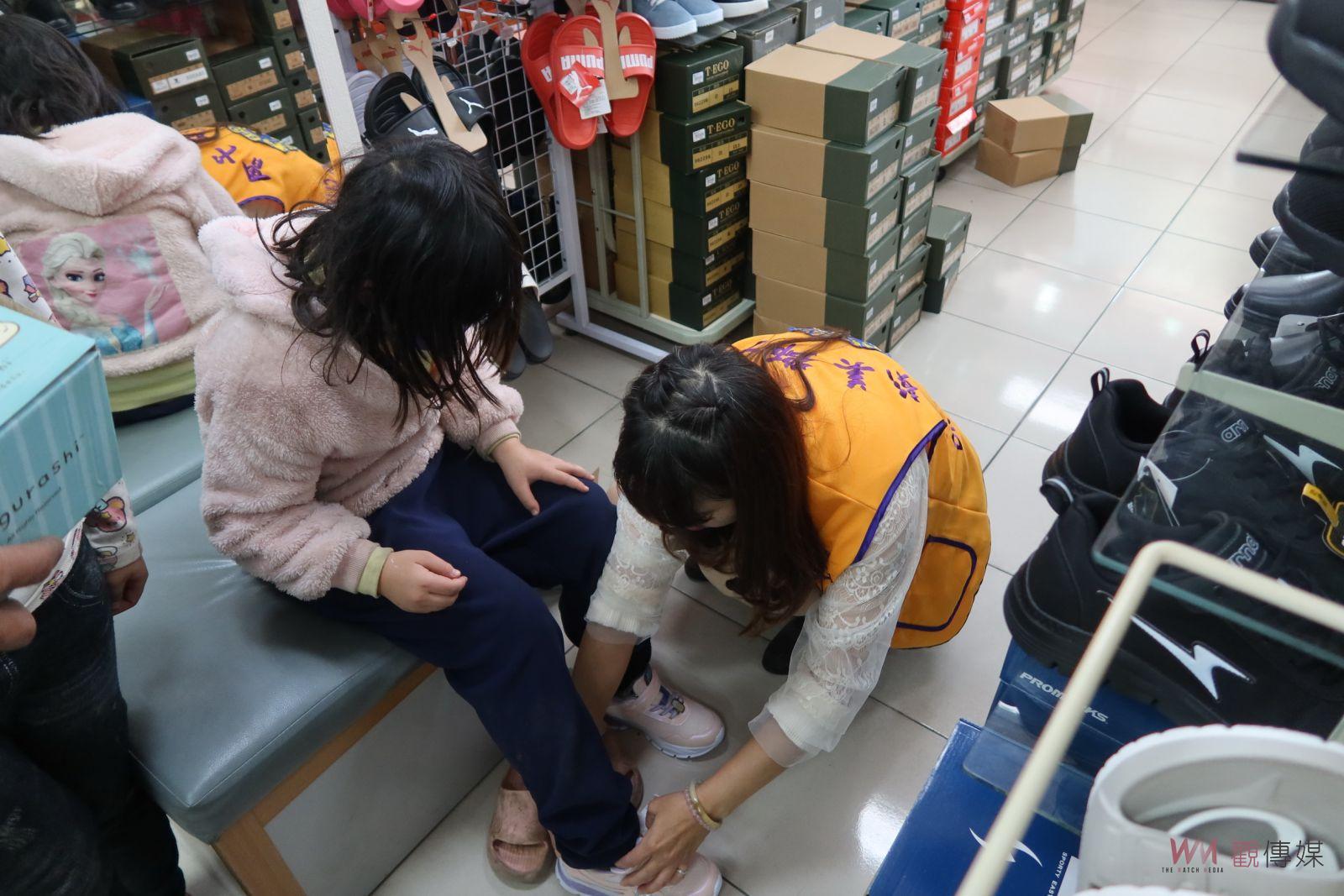 ▲彰美獅子會辦理「童心鞋力」活動,今年共贈出60雙優質好鞋,獅子會也熱心的幫他們聊一下腳丫子。