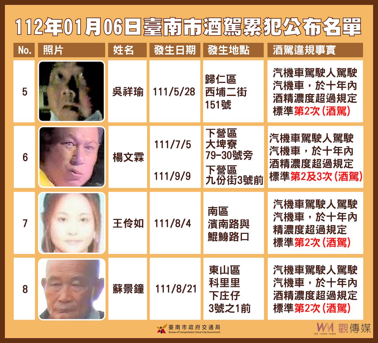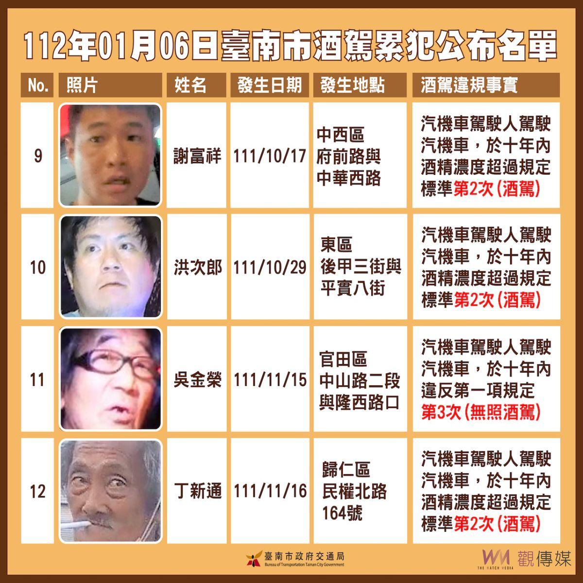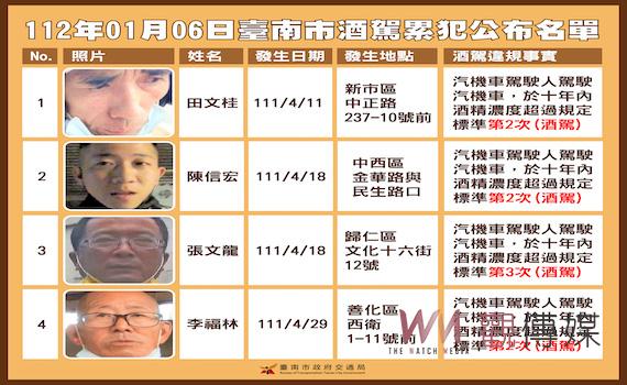 (觀傳媒台南新聞)【記者陳彥霖/台南報導】台南市政府公布第17批酒(毒)駕累犯名單,本次公布12名累犯違規人,累計公布118人。本次公布違規地點分別在新市區1名、中西區2名、歸仁區3名、善化區1名、下營區1名、南區1名、東山區1名、東區1名、官田區1名,台南市交通局依法公布姓名、照片及違法事實等資訊。