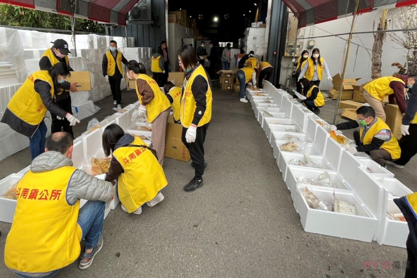 ▲斗南鎮公所員工將380份的溫馨年菜裝箱準備發送給鎮內弱勢家庭。