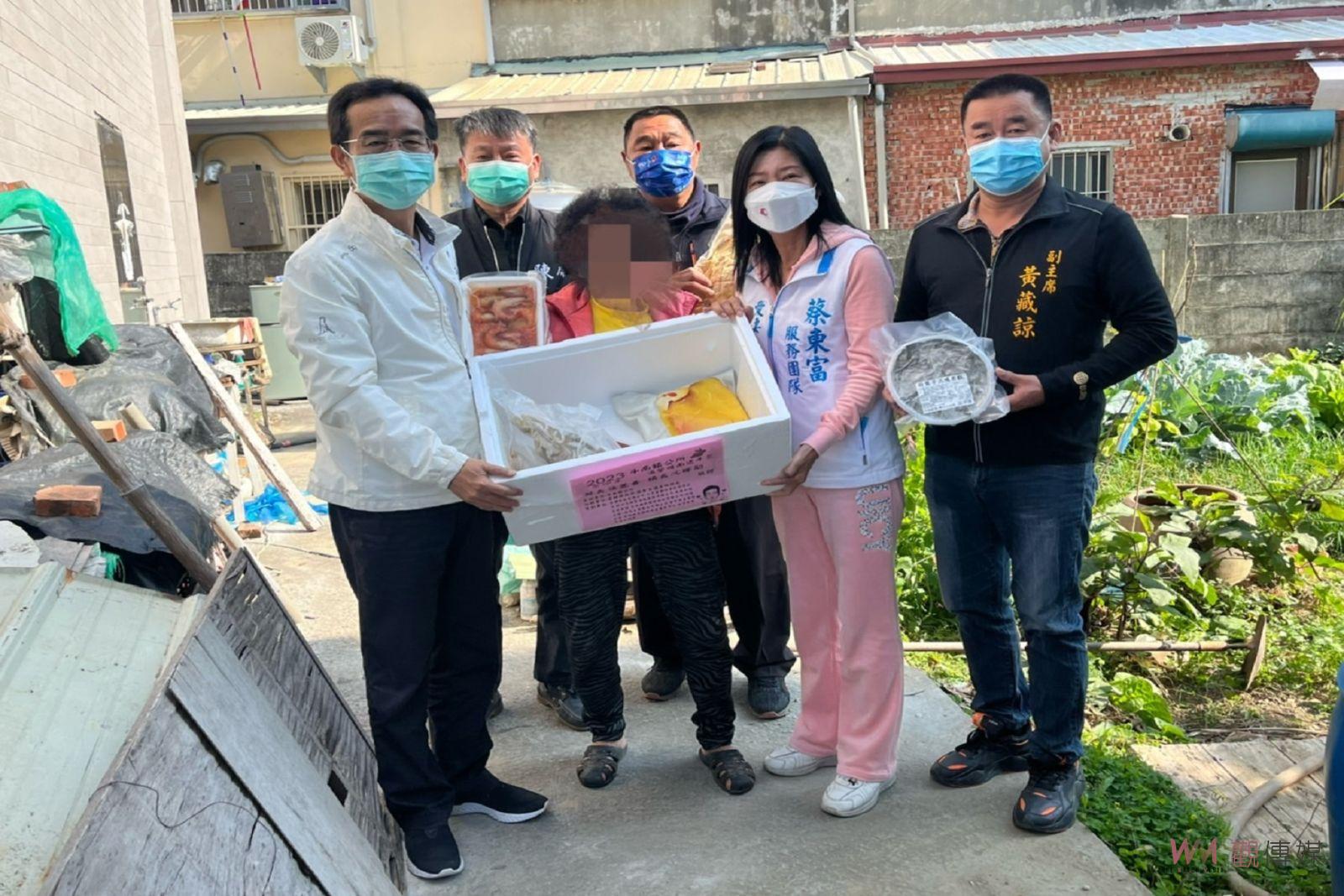 ▲縣議員蔡東富夫人洪惠玲和鎮長沈暉勛等親自將愛心年菜送給弱勢家庭。