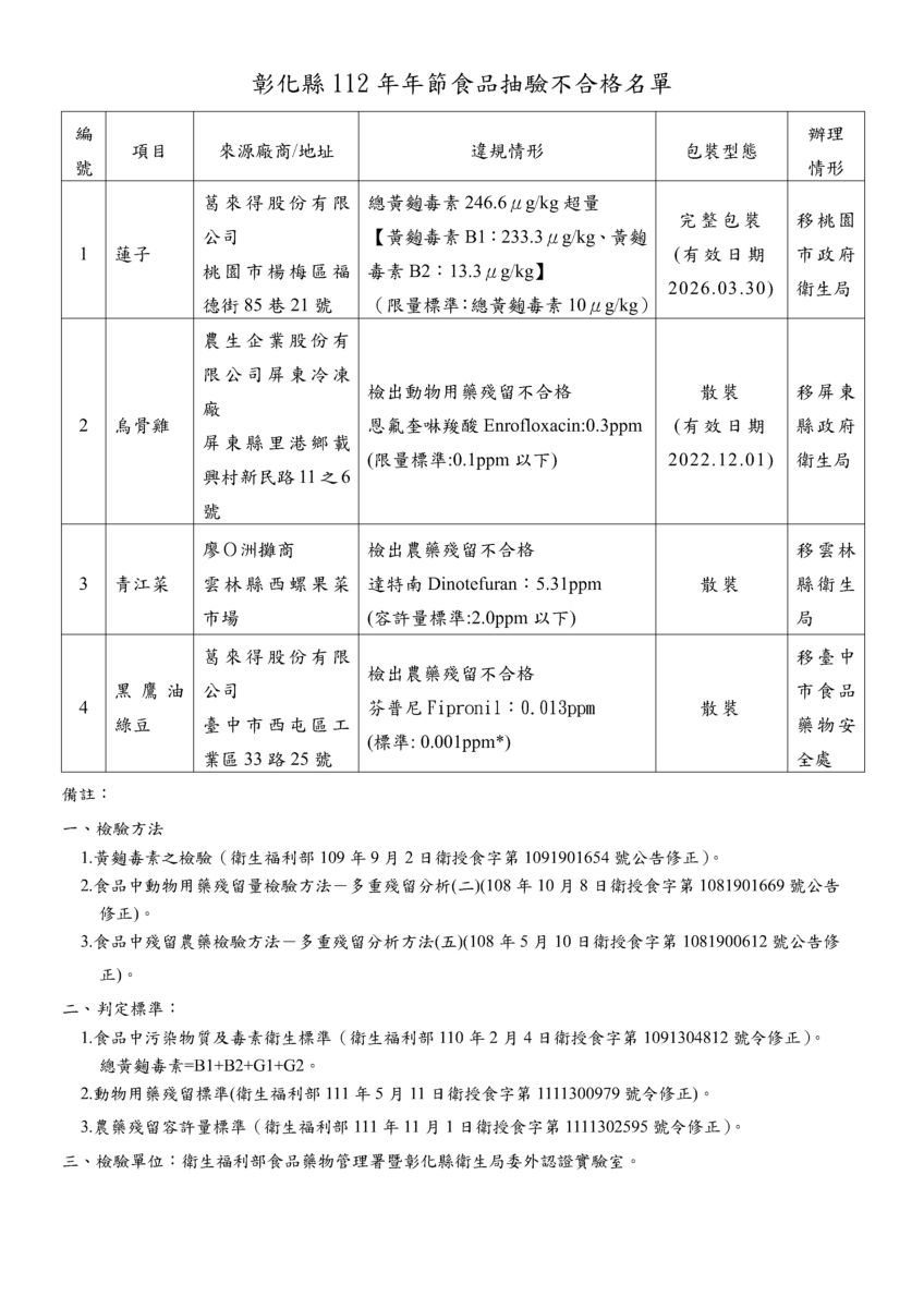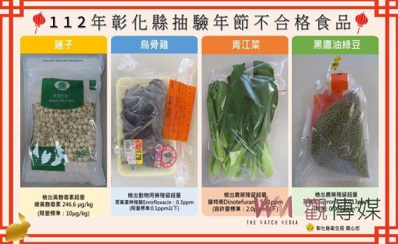 (觀傳媒彰化新聞)【記者陳雅芳/彰化報導】為維護民眾採買年節食品安全,彰化縣衛生局抽驗市面上禽畜水產及加工品、生鮮蔬菜、醃漬蔬菜、乾貨、糕粿類、蜜餞糖果類、堅果類等計146件,檢驗結果有4件不合格,包括中國進口蓮子、烏骨雞、青江菜以及緬甸進口綠豆,違規率2.7%,不合格產品均已令業者下架停止販賣。