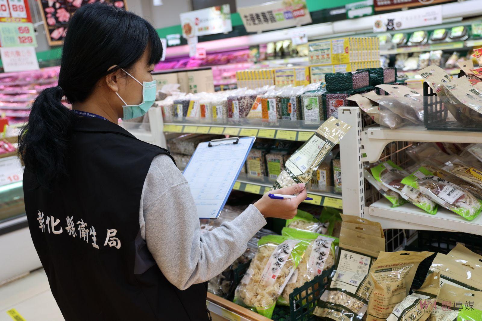 ▲彰化縣衛生局針對食超市、大賣場、傳統市場、食材批發商、食品製造業、餐廳及網路等販賣的年節食品進行稽查,不合格產品均已令業者下架停止販賣。