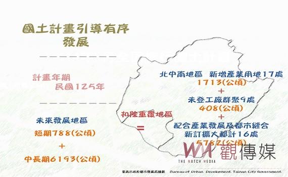都市發展局局長徐中強表示,台南市國土計畫以125年為目標年,依照全市土地資源特性、環境限制,通盤考量人口、產業、都市計畫縫合等需求,指認適宜發展區位,全市規劃近7千公頃未來發展地區(短期788公頃、中長期6,193公頃),包括17處新增產業用地、9處未登記工廠群聚地區、16處新訂擴大都市計畫等,除屬短期5年內需開發利用者劃設為城鄉發展地區第2-3類外,其餘按照通案性原則劃設適當國土功能分區。