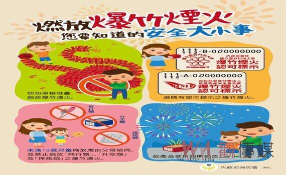 同時,也提醒如要燃放爆竹煙火,為確保安全,應購買附有認可標示的爆竹煙火,遵照產品使用說明施放;不可同時大量串接、堆疊燃放或朝人、車、建築物發射煙火,以保護自身及周遭安全。
