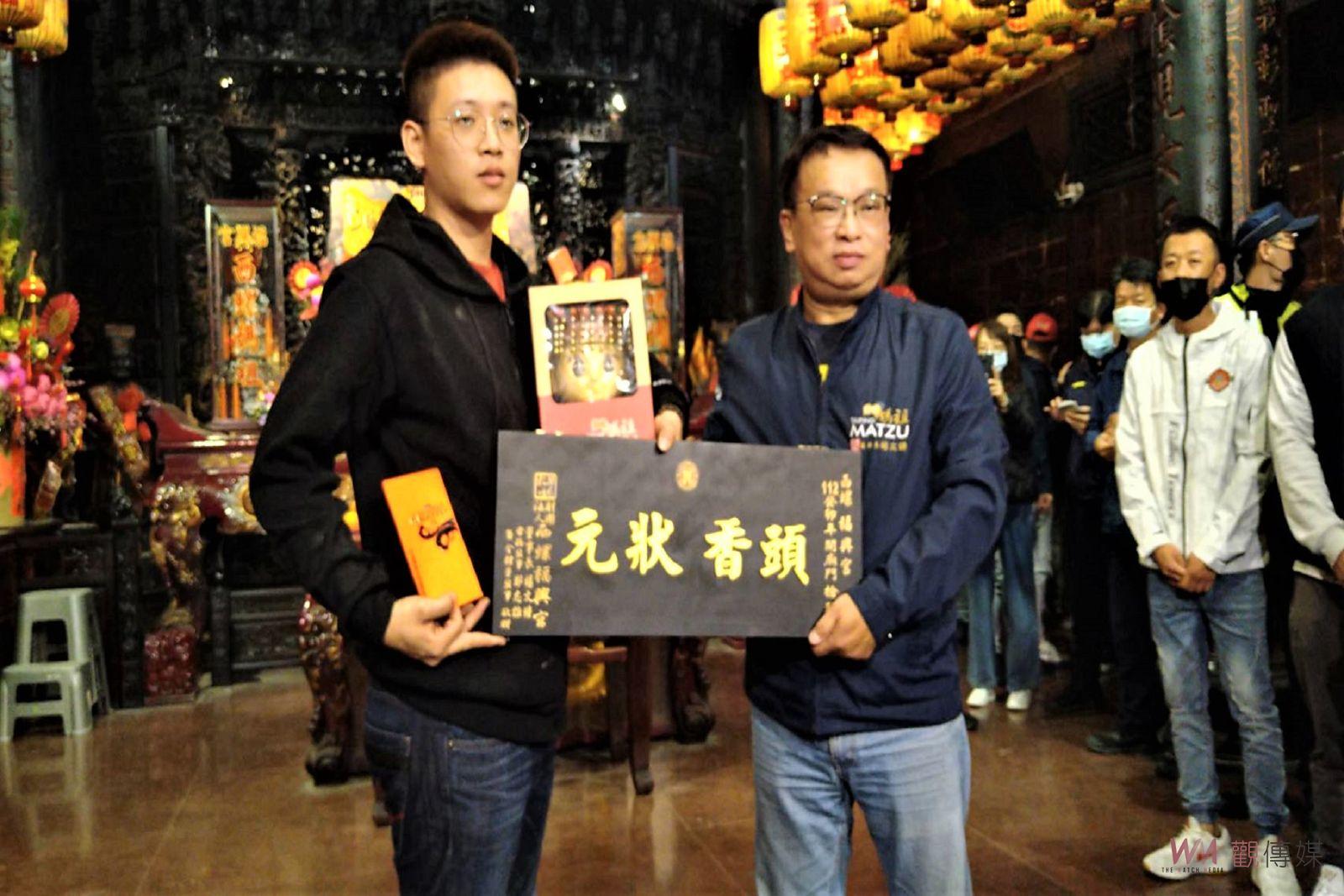 ▲頭香狀元陳信宏獲福興宮董事長楊文鐘頒贈頭香狀元匾額、現金獎8888元、太平媽陶瓷公仔和文創商品等。