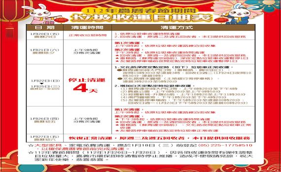 環保局指出,春節期間因各項收運時間有彈性調整且垃圾量大,嘉義市環保即時通停止推播。環保工作是每位市民共同的責任,請做好垃圾分類,將垃圾分為一般垃圾、資源回收及廚餘回收三類,一般垃圾丟入垃圾車,廚餘可以直接倒入垃圾車後的廚餘桶,回收再利用;資源回收物資請市民整理打包後,在每週資源回收車來的時候直接交給回收車,如果分類做得好,將可減少垃圾量,降低全民環保成本;亦符合循環經濟之理念。民眾如有倒垃圾的相關問題,可以電洽嘉義市政府環境保護局(電話05-2251775#510)詢問。