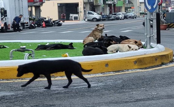 ▲彰化市和平路口圓環綠地常吸引來10多隻流浪犬來曬太陽,圓環公園竟成了「曬狗場」,流浪犬躺綠地上曬太陽享受日光浴等放飯,恐衍生交通安全與衛生問題。