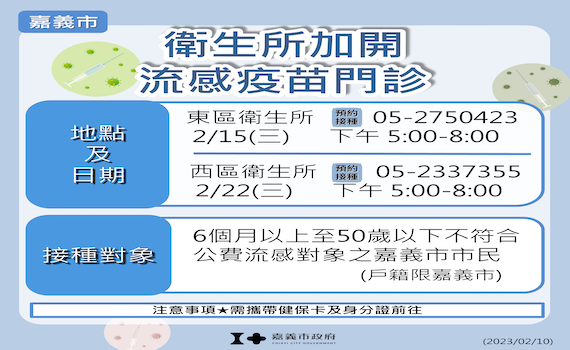 因應冬春交際、乍暖還寒是流感好發季節,接種流感疫苗是預防流感最有效的方法,嘉義市政府為守護市民健康,避免市民罹患流感引發嚴重併發症,已自2月6日起加碼新增「6個月以上到50歲以下,不符合公費流感對象之嘉義市民(戶籍限嘉義市)」為流感疫苗接種對象,可以「免費接種」。