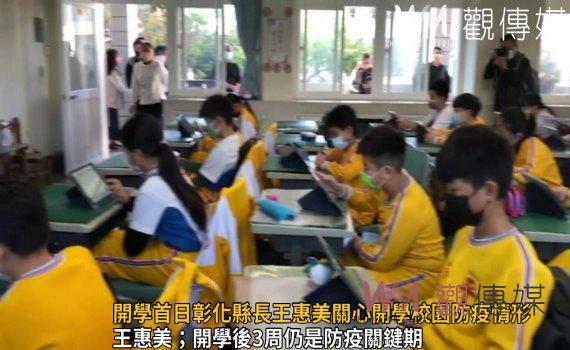 ▲開學日!彰化縣長王惠美視察彰化市平和國小開學防疫工作,王惠美說,開學後2、3周是最關鍵時期,也提醒學生仍要做好防疫措施。