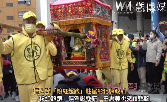 (觀傳媒彰化新聞)【記者陳雅芳/彰化報導】在12萬多名香燈腳擁簇下,苗栗縣通霄白沙屯拱天宮媽祖9天8夜進香之旅,行動飄忽不定的「粉紅超跑」今(14)日進駐到彰化縣政府,縣長王惠美說,今2月14號情人節,「媽祖媽祖我愛您!」提醒所有信眾,近期天氣轉冷,記得把身體顧好,沿路的鄉親提供了食物、飲料供信眾們享用,願信眾們能平平安安的走完這趟媽祖之旅。