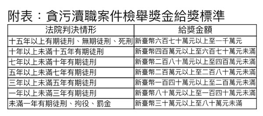 ▲檢舉查獲貪瀆犯罪檢舉人最高有新台幣1000萬元獎金。