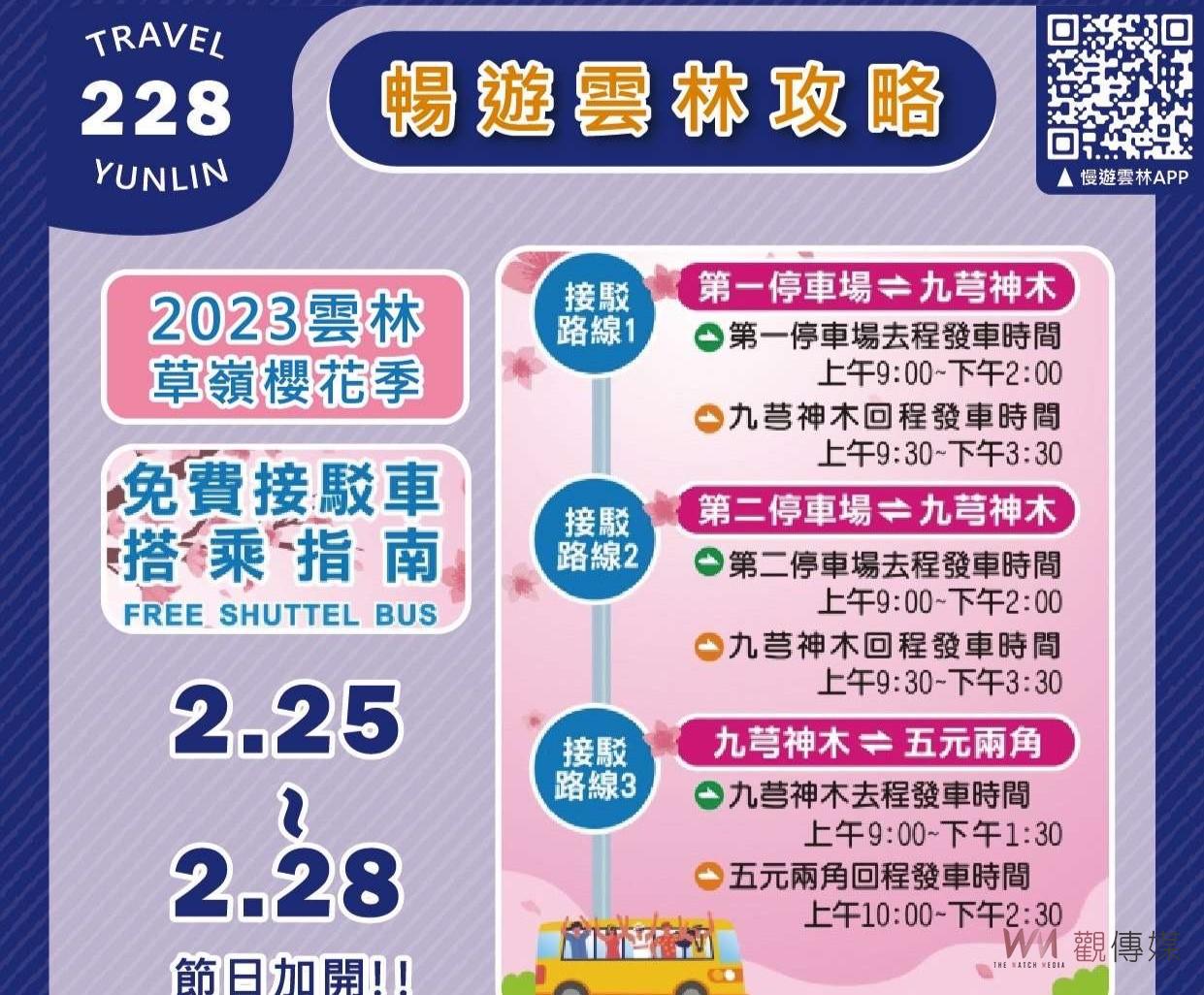 工務處長汪令堯說明,為維持賞櫻品質及交通秩序,縣府於草嶺櫻花季賞櫻期2月1日至3月5日期間進行交通管制措施,因應即將到來的連續假期,古坑鄉公所提供3條免費接駁路線:1、於草嶺第一停車場往返九芎神木,第一停車場去程發車時間為上午9:00~下午2:00,九芎神木回程發車時間為上午9:30~下午3:30;2、於草嶺第二停車場往返九芎神木,第二停車場去程發車時間為上午9:00~下午2:00,九芎神木回程發車時間為上午9:30~下午3:30;3、於九芎神木往返五元兩角,九芎神木去程發車時間為上午9:00~下午1:30,五元兩角回程發車時間為上午10:00~下午2:30,服務路線皆免費搭乘,鼓勵民眾多運用公共運具。