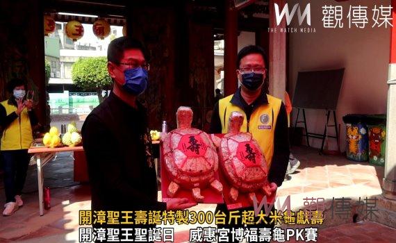 (觀傳媒彰化新聞)【記者陳雅芳/彰化報導】建廟迄今已有290年歷史。彰化市聖王廟主祀號稱漳州人守護神的「開漳聖王」,今(6)日適逢聖王聖誕日,為了向聖王祝壽,特別精心製作了300台斤重的超大組合米龜,相當吸睛,將於祝壽典禮結束後由信眾擲筊,擲出最多聖筊、且附帶捐獻3萬6000元緣金,可擁有此大米龜。