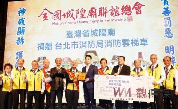 (觀傳媒台北新聞)【記者潘明賜/台北報導】台北市長蔣萬安今(8)日出席全國城隍廟聯誼總會活動,接受台北市台灣省城隍廟捐贈,價值高達1,000萬元的30公尺雲梯消防車,蔣萬安回贈感謝狀和雲梯消防車模型,感謝廟方熱心公益回饋社會,協助推動市政。