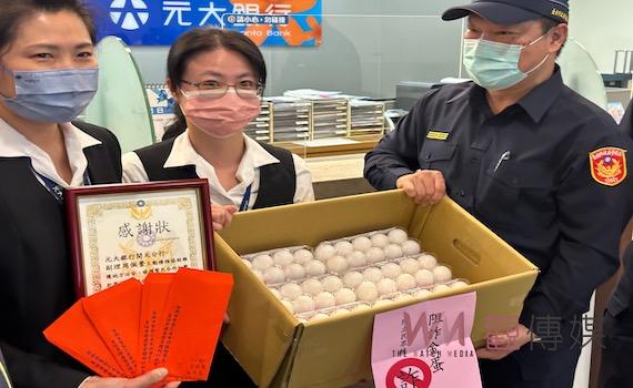 除頒發有功人員獎狀、禮券及禮品外,第五分局加碼頒贈「阻詐蛋」30顆;另外,攔阻件數最多的為元大銀行開元分行4件,每件加碼頒贈「阻詐蛋」15顆,共計60顆;行員見到實用的「阻詐蛋」,個個都笑開懷,感謝警方的用心,也欽佩其創意,大家開心地說,「這幾天晚餐可以加菜,未來也會更加努力與警方共同阻詐」。