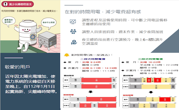 嘉義區處處長許墩貴在會中表示,以往的尖峰時段是落在下午1~2點,因應政府再生能源政策,太陽能生力軍大量併網下,目前天氣好時,中午太陽光電發電佔比可高達20%,隨著太陽下山,發電佔比也越來越低,因此尖峰時段移至了傍晚6~8點,形成了「夜尖峰」。112年開始高壓用戶的夏月期間調整自5月16日至10月15日,由原來4個月擴大為5個月,請各位高壓用戶要留意。