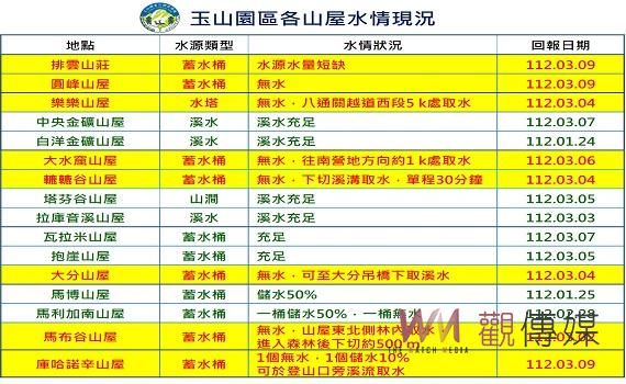 玉山國家公園園區橫跨南投縣、嘉義縣、高雄市及花蓮縣等4縣市,除花蓮縣屬東部區域外,其餘3縣市均位於新竹以南,顯現玉山國家公園園區內正受天候因素,處於缺水困境。玉山園區山屋缺水備妥用水謹慎使用玉山國家公園嚴重缺水,園區16座山屋,八通關越嶺道東段之瓦拉米山屋、抱崖山屋蓄水桶儲水充沛,但大分山屋無儲水,需至大分吊橋下取溪水使用;馬博橫段、南二段及關山線之山屋,如馬博拉斯山屋、 馬利加南前山屋、馬布谷山屋、白洋金礦山屋、中央金礦山屋、大水窟山屋、塔芬谷山屋、轆轆谷山屋、拉庫音溪山屋及庫哈諾辛山屋等處蓄水桶均無儲水;熱門的玉山群峰線,排雲山莊水源水量已短缺,圓峰山屋蓄水桶已無儲水。