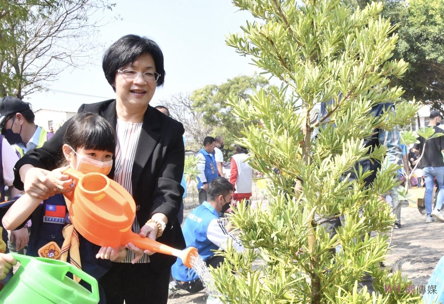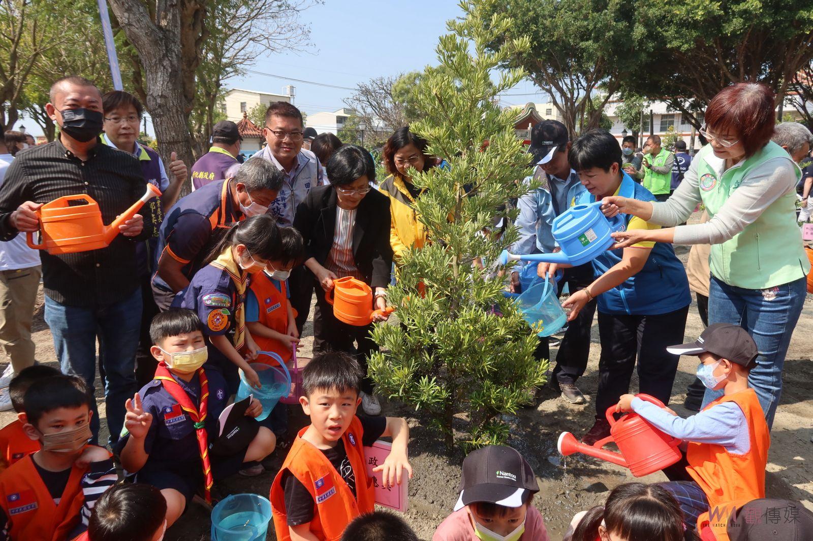 王惠美表示,現場有大小童軍、社區民眾,大手牽小手一起來種樹,種下蘭嶼羅漢松、白水木、小葉赤楠、月橘等4種本地原生樹種,各鄉鎮市公所近期也有一起響應植樹活動,縣府農業處也提供相關苗木的索取,鼓勵大家「種樹種福田」,地球暖化,植樹減碳,大家一起為家鄉土地種下希望,一起愛護地球。