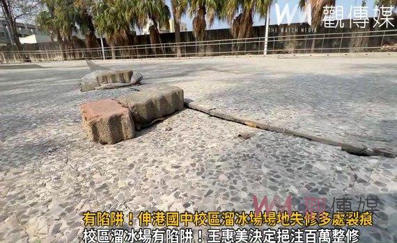 ▲伸港國中第二校區溜冰場場地多處裂痕、破損,還有些地方隆起,彰化縣長王惠美視察時當場決定要挹注百萬經費整修。