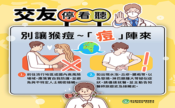衛生局呼籲,猴痘傳播對象具侷限性,此波疫情係以親密接觸之人際傳播為主,因此提醒民眾前往流行地區或國內風險場域時,應落實自我防護,並避免出入可能與不特定人士親密接觸之社交活動等風險場域。如出現皮膚病灶,例如:皮疹、水泡、斑疹、斑丘疹、膿疱等,以及發燒、畏寒/寒顫、頭痛、肌肉痛、背痛、關節痛、淋巴腺腫大(如耳周、腋窩、頸部或腹股溝等處)等疑似症狀,應佩戴口罩儘速就醫,並主動告知醫師旅遊史、高風險場域暴露史及接觸史。並鼓勵「近6個月內曾有高風險性行為民眾」至疾管署「猴痘疫苗接種意願登記平台(https://mpox.cdc.gov.tw/ )」進行接種暴露前預防(PrEP)疫苗意願登記。相關資訊可至疾管署全球資訊網(https://www.cdc.gov.tw)或撥打國內免付費防疫專線1922(或0800-001922)洽詢。