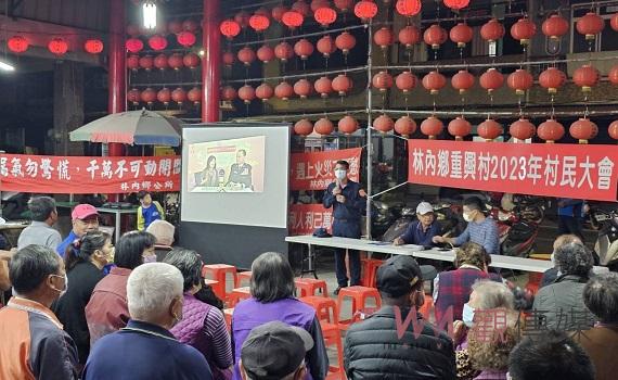 斗六分局利用村民大會時間,由分局長黃念生率分局幹部及重興派出所同仁參加,藉機向鄉親們進行防詐、識詐及交通安全宣導。