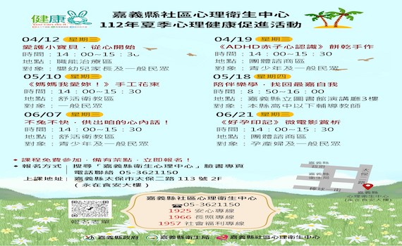 (觀傳媒嘉義新聞)【記者 惲 朋 /嘉義報導】 嘉義縣社區心理衛生中心為促進縣民心理健康,特延續春季免費課程,規劃夏季心理健康促進系列課程,與教育處合作,安排互動式遊戲、角色扮演、微電影賞析、舒活身心靈講座等豐富課程,縣政府歡迎民眾踴躍參與。