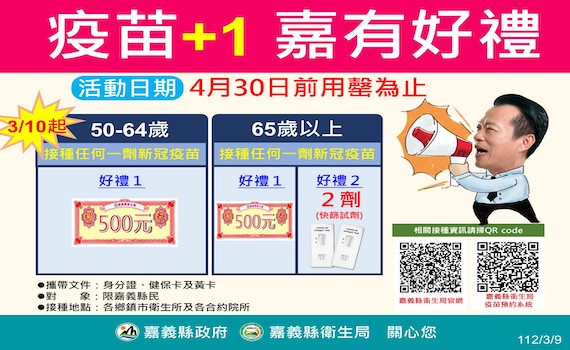 (觀傳媒嘉義新聞)【記者 惲 朋 /嘉義報導】 嘉義縣政府配合中央「疫苗+1 解封安心」全民接種新冠疫苗政策,自3月10日起推出設籍嘉義縣50歲以上民眾打新冠疫苗任何一劑即可獲500元禮券,活動期限只到4月30日止,而且額度前完就停發;清明連假各鄉鎮市衛生所及合約院所疫苗接種服務也不打烊。