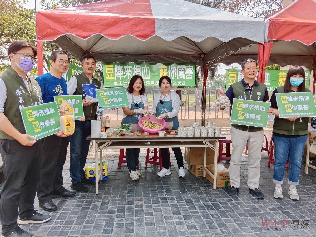 (觀傳媒雲林新聞)【記者洪佳伶/雲林報導】民進黨雲林縣黨部今(18)日在北港運動公園舉辦公益捐血活動,議員洪如萍、縣黨部主委林金忠、副執行長邱世文、北港鎮鎮民代表許玉明、蔡岳儒議員服務處秘書陳泰佑等黨公職都熱情響應外,也吸引許多熱情民眾挽袖捐血、做公益,現場另有涼拌豆皮料理,讓捐血民眾不僅獲得雲林蒜頭2斤及莿桐黑蒜頭1包、3盒豆皮之外,現場還可品嘗涼拌豆皮,馬上補充蛋白質。