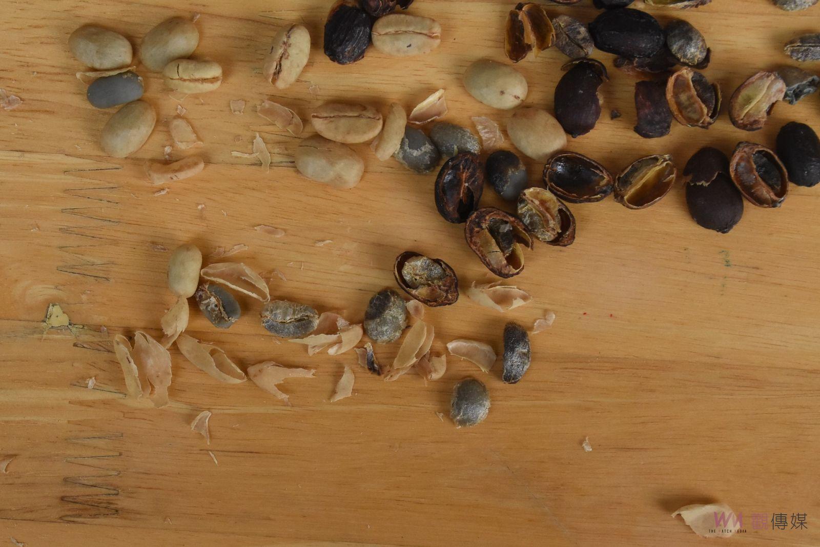 ▲雲林古坑咖啡產量因受乾旱影響嚴重損害銳減,看起豐碩漂亮的果實,採收生豆時卻都變成嚴重受災害的黑豆,收成率不到兩成。