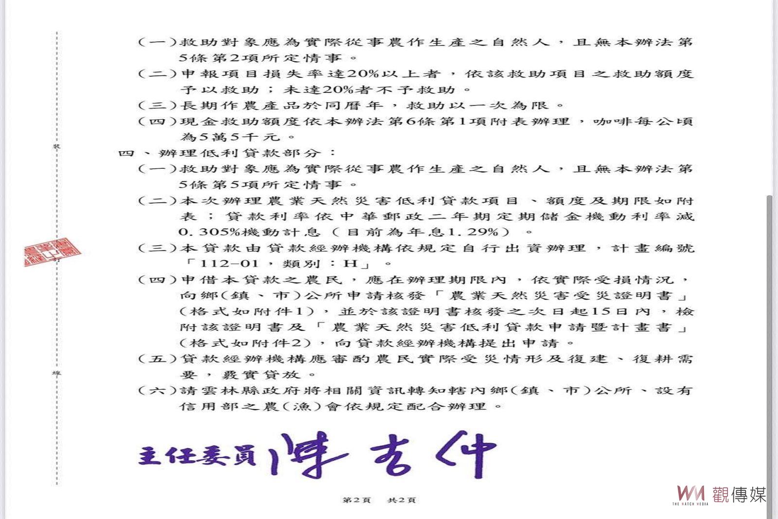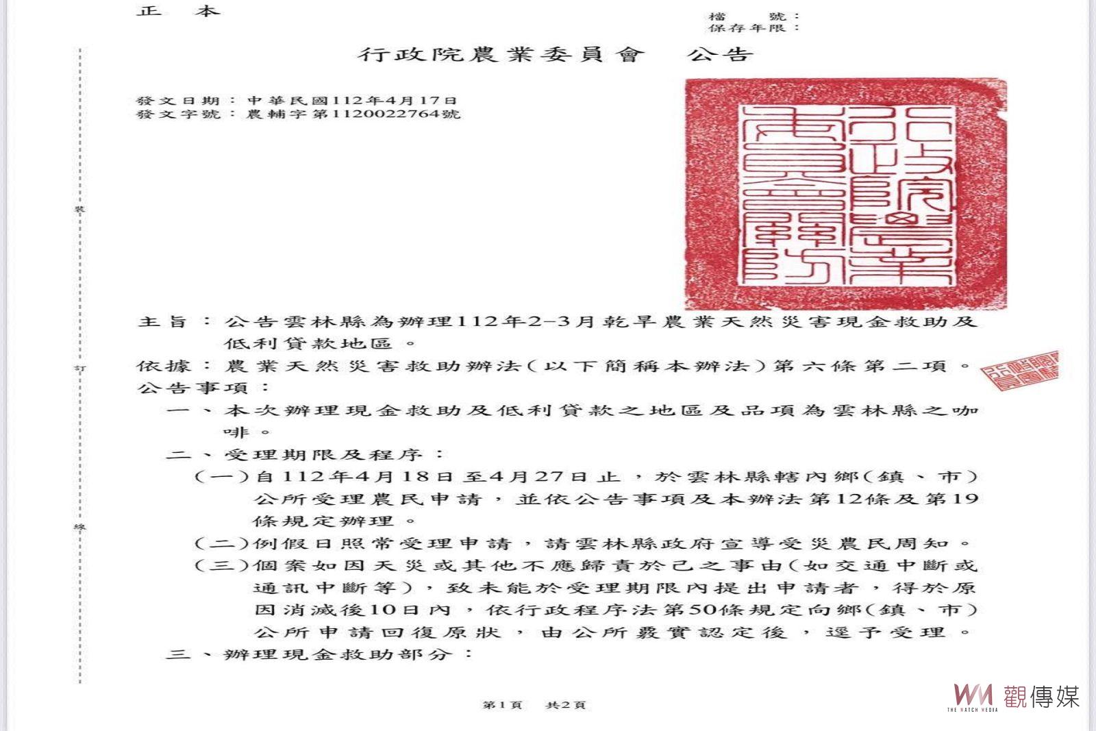 針對古坑咖啡田乾旱受災影響收成,行政院農業委員會在112年4月17日的農輔字第1120022764號公告,雲林縣咖啡受天然災害辦理現金救助及低利貸款救助辦法,自112年4月18日至4月27日止,雲林縣轄內鄉(鎮、市)公所受理農民申請,並依公告事項及本辦法第12條及第19條規定辦理;現金救助額度依本辦法第6條第1項附表辦理,咖啡每公頃為5萬5千元,其詳細申報辦法,可洽鄉鎮市公所或縣政府等相關單位。