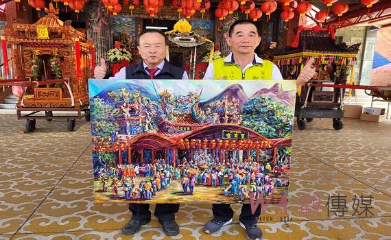 (觀傳媒嘉義新聞)【記者邱嘉琪/嘉義報導】嘉義番路國際畫家陳明順,以一個月的時間,以印象派畫風,彩繪在地菜公店聖玄宮的普渡場景圖,並選在主神玄天上帝萬壽聖誕(農曆三月初三)的前一天正式發表,21日特別於廟前廣場,分贈1千份北極玄天上帝小版畫與參拜民眾結緣,此畫明年二月可望於法國皇宮展覽,爾後將永久於聖玄宮永久展示,讓東、西方都能感受到台灣信仰文化之美。