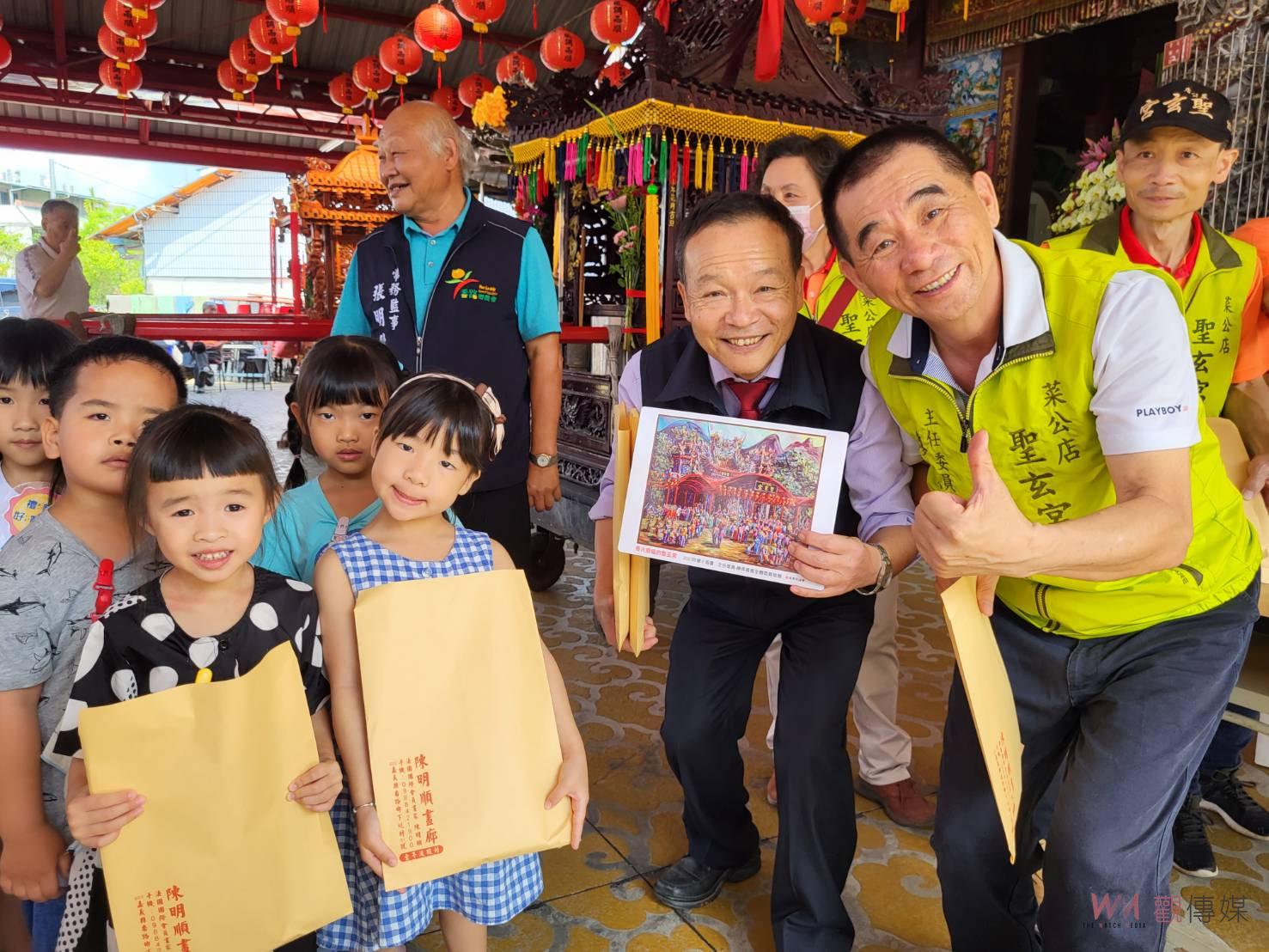 ▲國際畫家陳明順(右二)與聖玄宮主委廖長義(右一)分送北極玄天上帝小版畫給小朋友。