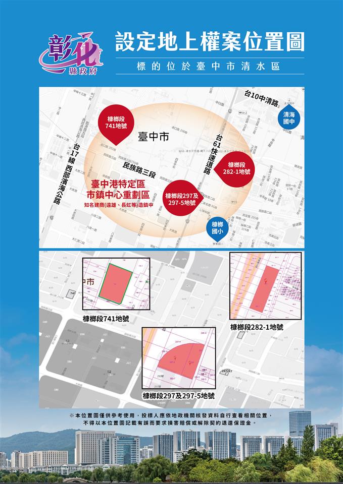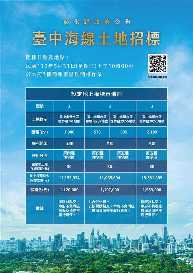 ▲彰化縣政府公告3案位於臺中海線精華區縣有土地招標設定地上權案,歡迎各界踴躍投標。