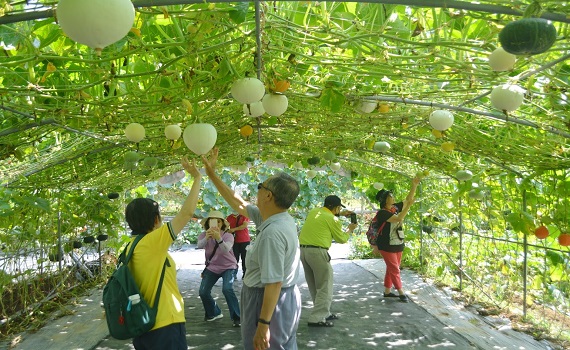 擁有50多年農務經驗的阿嬤謝簡素表示,雖然種植及整理藤蔓非常辛苦,但看到棚架上結實纍纍的南瓜並能和大家分享這漂亮的南瓜美景,非常有成就感,也希望前來拍照的遊客珍惜這期間限定的美景,不要隨意採摘瓜果及枝條,讓大家都能用相機留下美好回憶,鄰近還有大屯溪畔的屯山荷花池及適合賞夕陽的六塊厝漁港,歡迎大家來淡水輕旅行。